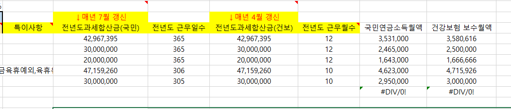 옆으로는 국민연금 소득월액, 건강보험 소득월액 정보를 입력하는 칸입니다. 각각 7월, 4월에는 업데이트되어야 하는 정보이니 참고해 주세요.