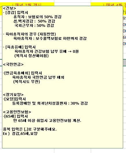아래 셀을 보시면 특이사항이라는 셀이 보이시죠? 특이사항은 국민연금/건강보험/고용보험을 계산하는 데 있어 특수 케이스를 반영할 수 있도록 표시한 셀입니다. 오른쪽 빨간 세모에 커서를 올리시면 해당 설명이 나오니 참고해 주세요.