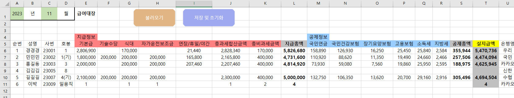 1) [불러오기] 버튼을 누르시면 지급정보시트와 공제정보시트를 바탕으로 각종 금액자료가 넘어옵니다.