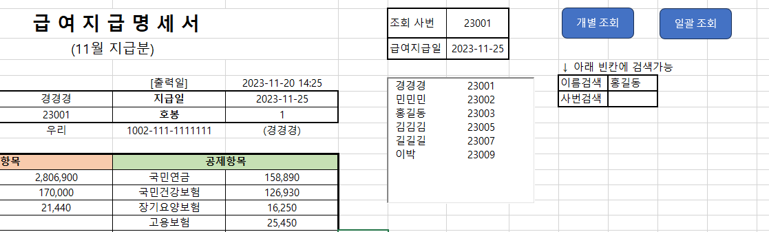 대장상의 구성원 전부의 급여명세서를 생성하여 새로운 파일로 만들어줍니다.
