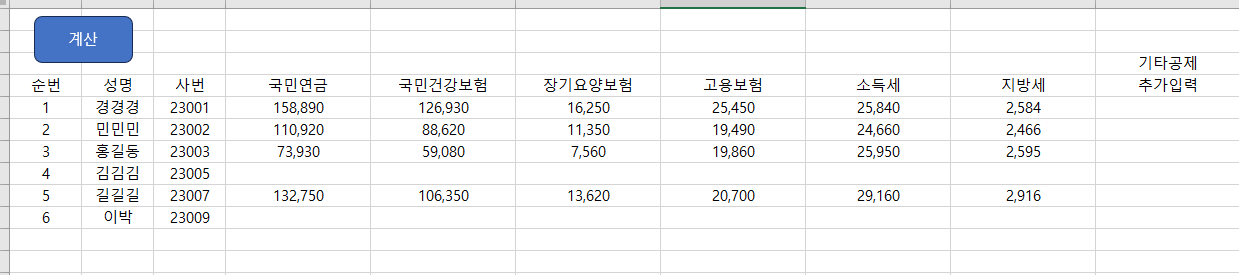 기본적으로는 지급정보시트와 유사합니다. 계산을 눌러 4대보험 정보, 소득세 정보 등을 끌고 오는 시트입니다.