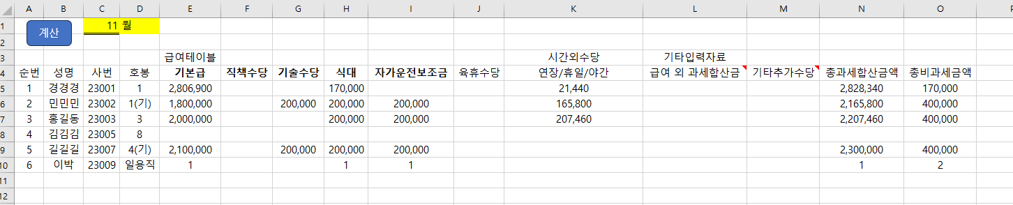 그럼 바로 한번 계산 버튼을 눌러보시죠. 계산 버튼을 누르시면, 위에서 계산된 시간 외 수당과 급여테이블상의 수당 정보들이 인원에 맞춰 불러와집니다.