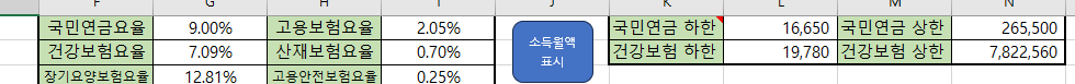 버튼 양옆으로 초록색 표가 보일 텐데요. 4대 보험의 각종 요율과 상한/하한액을 정리해 놓은 표입니다. 이 표를 기반으로 계산이 돌아갑니다. 추후 변동사항이 있을 시 표를 수정해 주시면 수정한 정보를 바탕으로 계산됩니다.