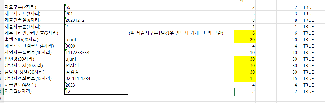 위 사진은 임의로 작성했습니다. 굵은 네모 박스 안에 해당사항을 다 기입해주셔야 하며, 세무대리인관리번호의 경우 제출자 구분 1(세무대리인) 일 경우에만 입력해 주시면됩니다. 각 사항마다 정해진 자리수가 있는데, 내용을 입력해주시면 자동으로 해당 글자수를 맞추도록 설정해 두었습니다.