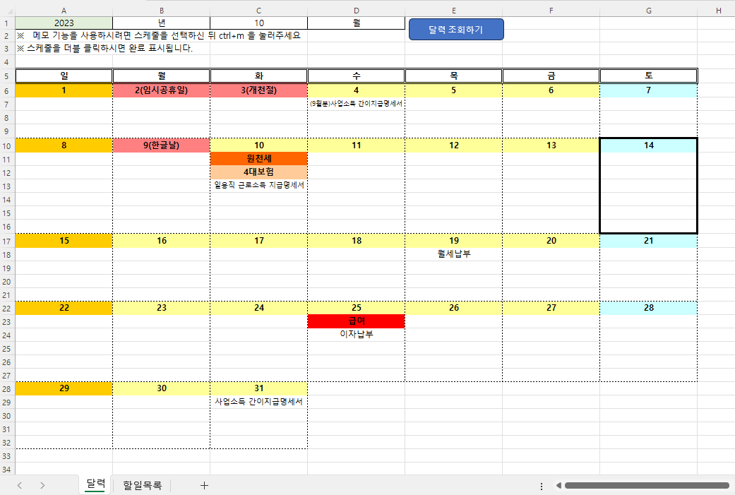 스케줄 정리용 엑셀 양식을 소개해드리려고 합니다. 매월 달력을 조회가능하고, 할 일 목록을 미리 입력해 두면 해당월에 바로 띄울 수 있습니다. 업무를 정리하기 편하도록 몇 가지 기능을 구현해 봤으니 살펴보시죠.