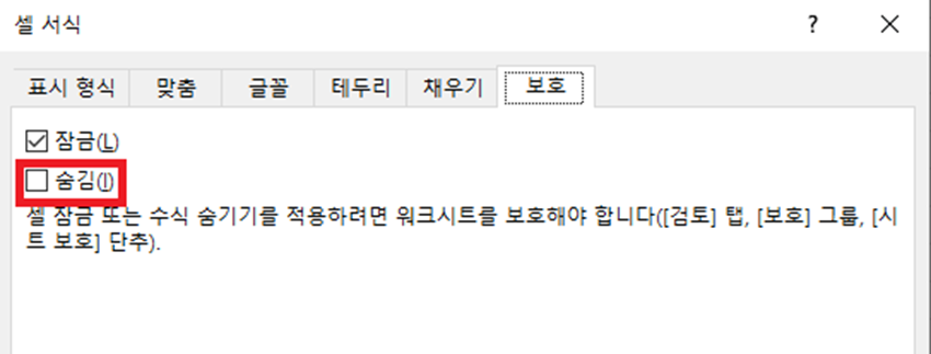 셀숨김은 해당셀 우 클릭 후 셀서식에서 설정이 가능합니다.