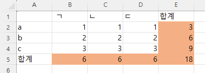 1) 합계는 데이터의 방향상 위에서 아래, 왼쪽에서 오른쪽에 위치해야 합니다. 아래 사진을 보시면 이해하기 쉽습니다.