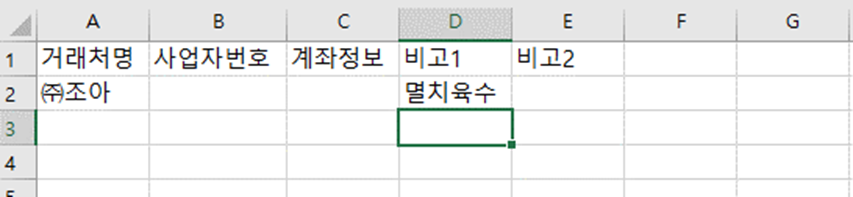 설명할게 별로 없는 시트입니다. 해당 시트에 정보를 기입해 두면, 추후 입력칸에서 거래처 입력 시 자동으로 정보를 끌고 옵니다.