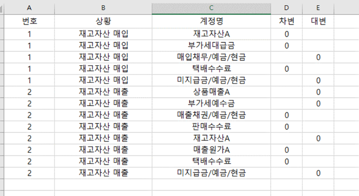 위 그림처럼 구성되어 있습니다. 왼쪽에 번호에 따라 하나의 세트로 구성됩니다. 상황은 메모용이고요. 실제로 입력칸에 불려 가는 데이터는 계정명/차변/대변입니다. 차변 대변에 0으로 표시해 둔 것은 해당거래에 대하여 어디에 기입해야 하는지 착오하지 않도록 표시해 둔 것입니다.