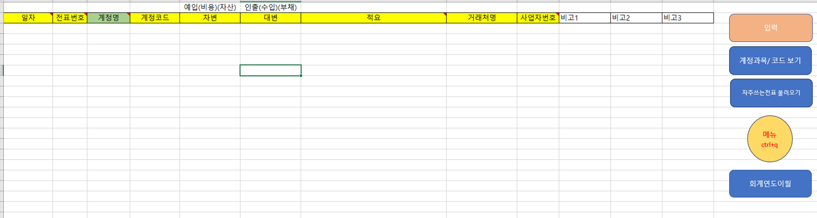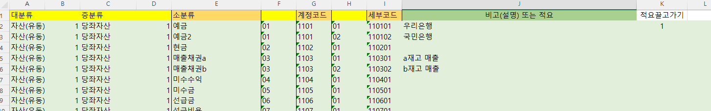 오른쪽에 비고 또는 적요라고 적혀있는데, 메모용으로 쓰셔도 좋고. 해당계정에서 반복적으로 사용하는 적요라면 적요를 미리 기입해 두셔도 좋습니다. 적요 기입 후 오른쪽에 숫자 1을 적어주시면. 입력칸에서 계정명/계정코드 입력 시 적요도 그대로 끌고 가도록 해놓았습니다.