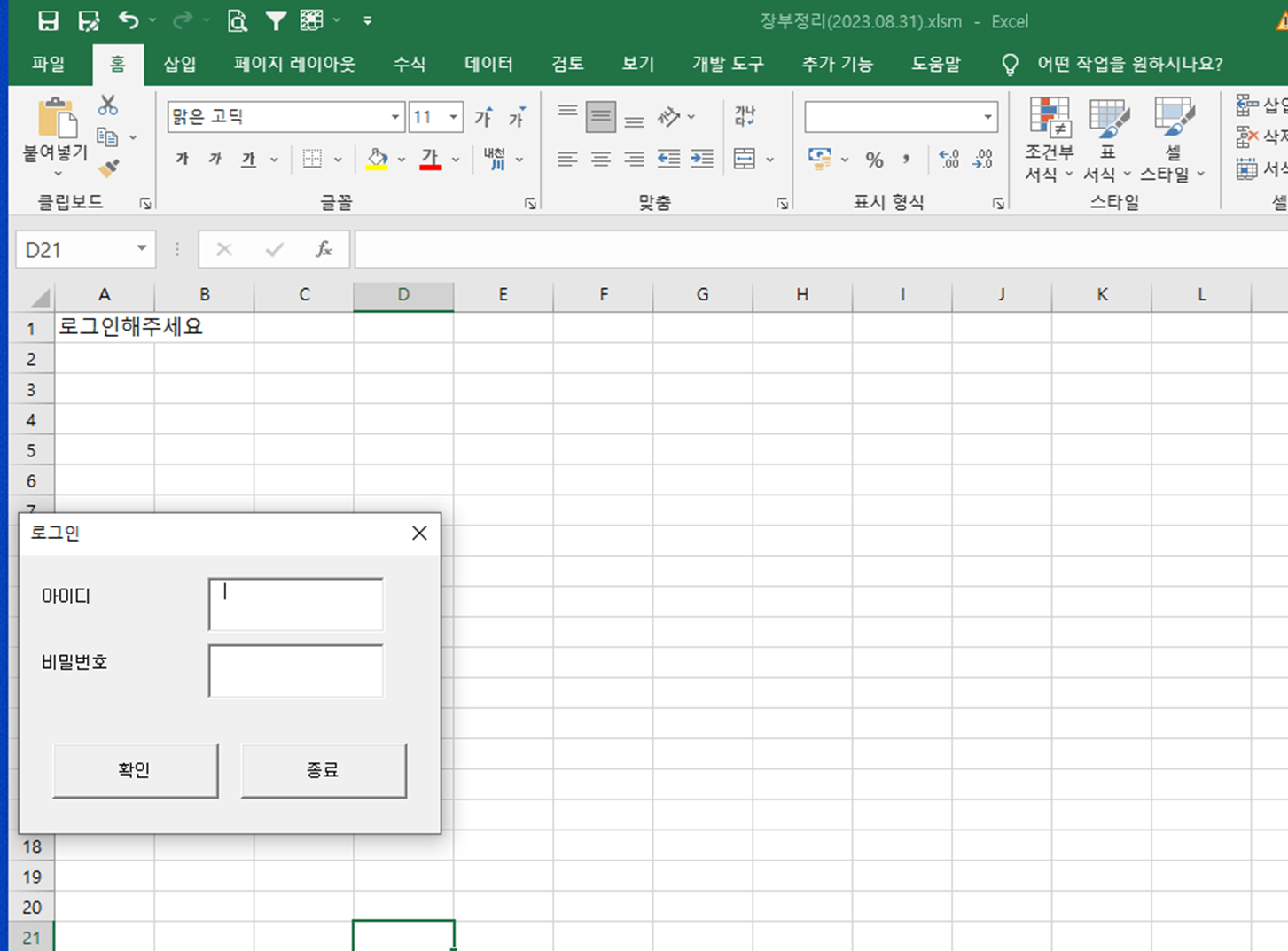 파일을 여시면 아래와 같은 화면이 뜨는데요. 아무래도 장부이다 보니 보안을 생각해 아이디 / 비밀번호를 입력해야 파일 활성화가 가능하게 만들어 두었습니다. 아이디 / 비밀번호는 추후 변경이 가능합니다. 초기설정은 q11/q11입니다.