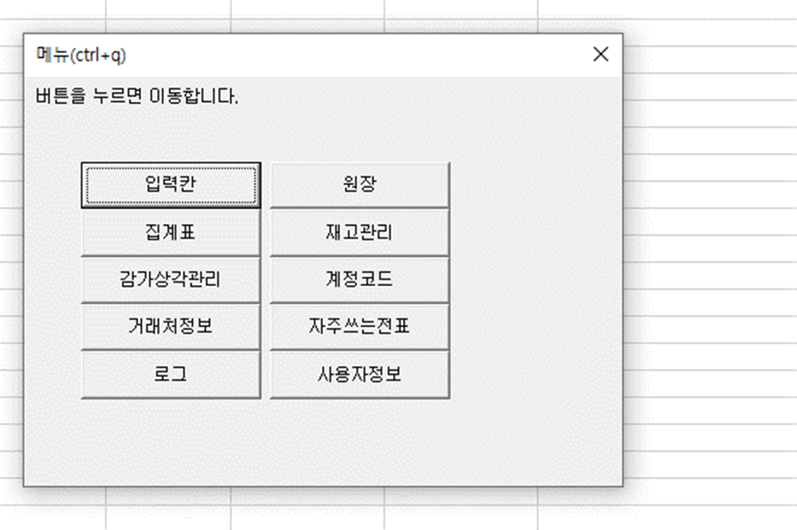 로그인하시면 가장 먼저 메뉴창이 뜹니다. 메뉴창에 나와있는 버튼은 엑셀 각 시트에 해당합니다. 시트를 전부 띄워두면 혼란스러울 수 있어, 기본적으로는 사용하는 시트만 뜨게 만들었으며 메뉴 창을 통해 이동이 가능합니다. ctrl+q 를 누르시면 메뉴창을 띄우실 수도 있습니다.