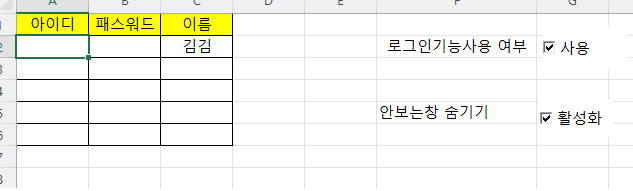 로그인기능을 설정할지 말지 선택이 가능하며, 시트 자동숨김 기능을 활성화할지 여부도 체크박스를 통해 설정 가능합니다.