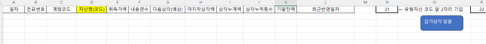 감가상가 자산은 노랗게 표시된 자산명(코드)을 기준으로 관리됩니다. 상각자산도 마찬가지 입력칸 시트에서 입력 시 어떤 코드를 사용하는지에 따라 데이터가 결정됩니다.