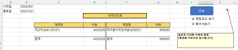 집계표를 보시면 시작일과 종료일이 보이실 겁니다. 해당 셀에 기간을 설정하여 조회하시면, 해당기간에 대한 자료가 집계됩니다. 테스트 삼아 넣어놓은 자료라 대차가 전혀 맞지 않지만, 일단 위처럼 조회가 되고요. 옆에 체크박스를 보시면 계정코드를 보이게도 안 보이게도 설정가능합니다. 또한 묶어서 보기 체크 박스를 해제하시면 계정코드별로 모든 항목이 다 표시됩니다. 묶어서보기 체크를 해주시면 6자리 계정코드 중 앞 4자리가 동일한 계정끼리는 합산하여 표시해 줍니다. 계정이 너무 다양하신 분들을 위한 기능입니다.