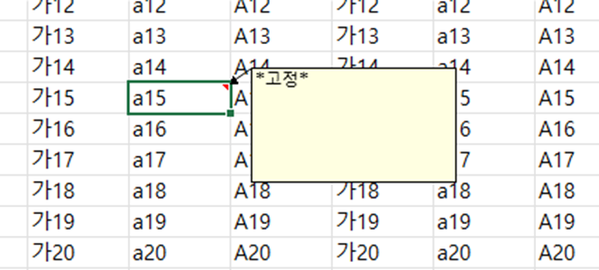 기능이 작동하면 해당셀 오른쪽 귀퉁이가 빨갛게 변할거에요. 위 그림 처럼 잠긴 셀은 *고정* 이라는 메모가 달리도록 설정해두었습니다. (기존에 노트가 존재하는 셀의 경우 노트의 내용은 유지한채 가장 앞단에 *고정*이라는 표시가 되도록 하였습니다.)
