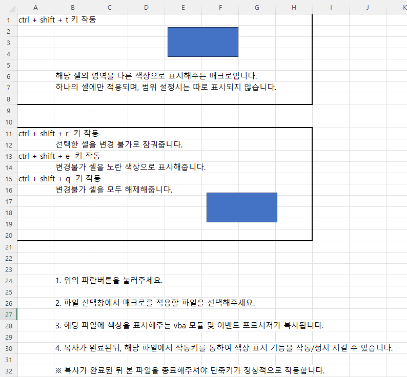 위와 마찬가지로 파란버튼을 눌러 작업할 파일에 매크로를 이식해 주시구요. 정상적으로 옮겨졌다면, 이제 셀 잠금과 관련된 단축키를 눌러봅시다.