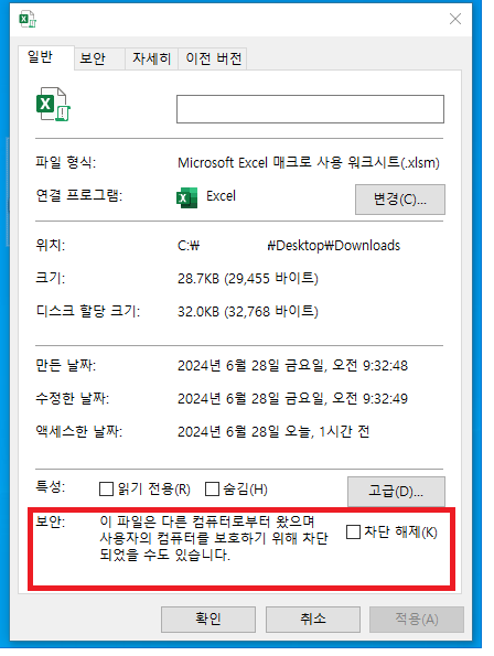 위 그림의 빨간 네모칸의 차단해제에 체크를 해주시면, 문제없이 매크로를 사용 하실 수 있습니다.