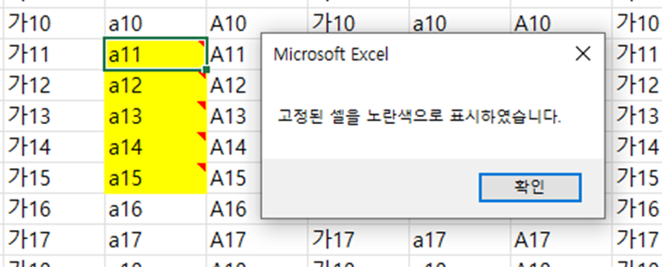 작업을 하다보면, 보호해야할 셀이 여러개가 되는 경우도 있습니다. 이럴때 귀퉁이의 빨간표시만 보고 어느 셀이 잠겨있는지 파악하기가 어려워지죠.